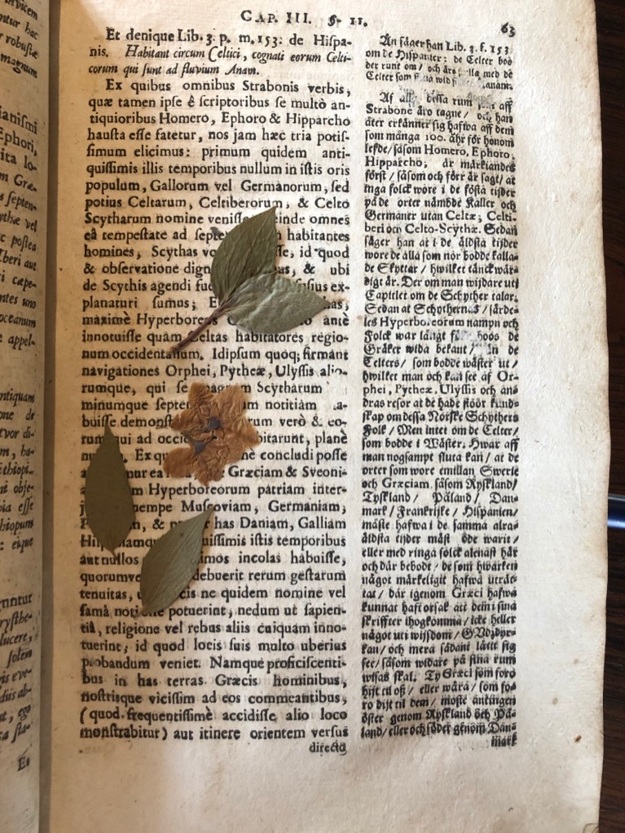 Chapter Three, “On the Time when Sweden was first Settled and by what People”. On the column of Latin words, just under the heading, lay two pressed blossoms, four leaves, and a stem. My heart missed a beat.